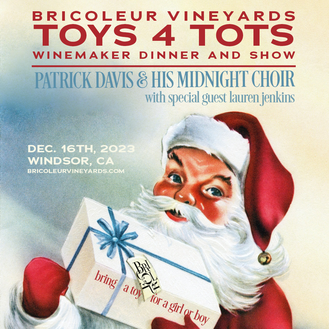 On Dec. 16th I am so excited to bring the Midnight Choir to the incredible BRICOLEUR VINEYARDS for their very 1st TOYS 4 TOTS Winemaker Dinner and Show!! Tickets & tables are moving fast so if you are out in the Sonoma/Napa area and want to have yourself one beautiful evening of wine, food, music & holiday cheer… well come on!!